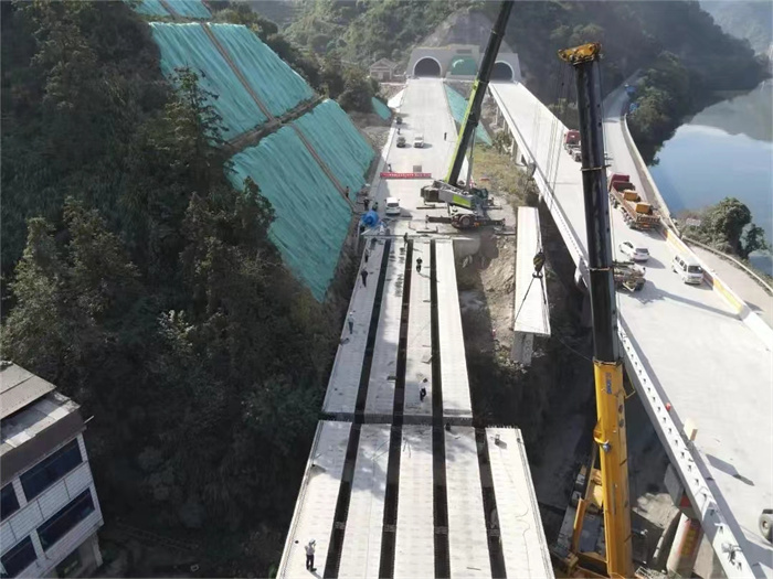 11月4日下午三時(shí)許,隨著最后一片30米T梁的成功架設(shè),衢交集團(tuán)承建的330國道麗水市塔下至臘口段公路改建工程(蓮都段)灣岙沿溪左線橋梁順利合攏,標(biāo)志著該項(xiàng)目沿線三座橋梁已全部架設(shè)完成。