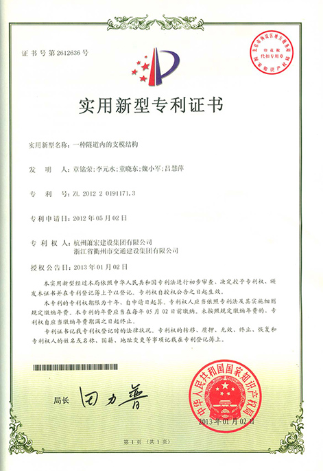 實用新型專利證書-隧道內的支模結構
